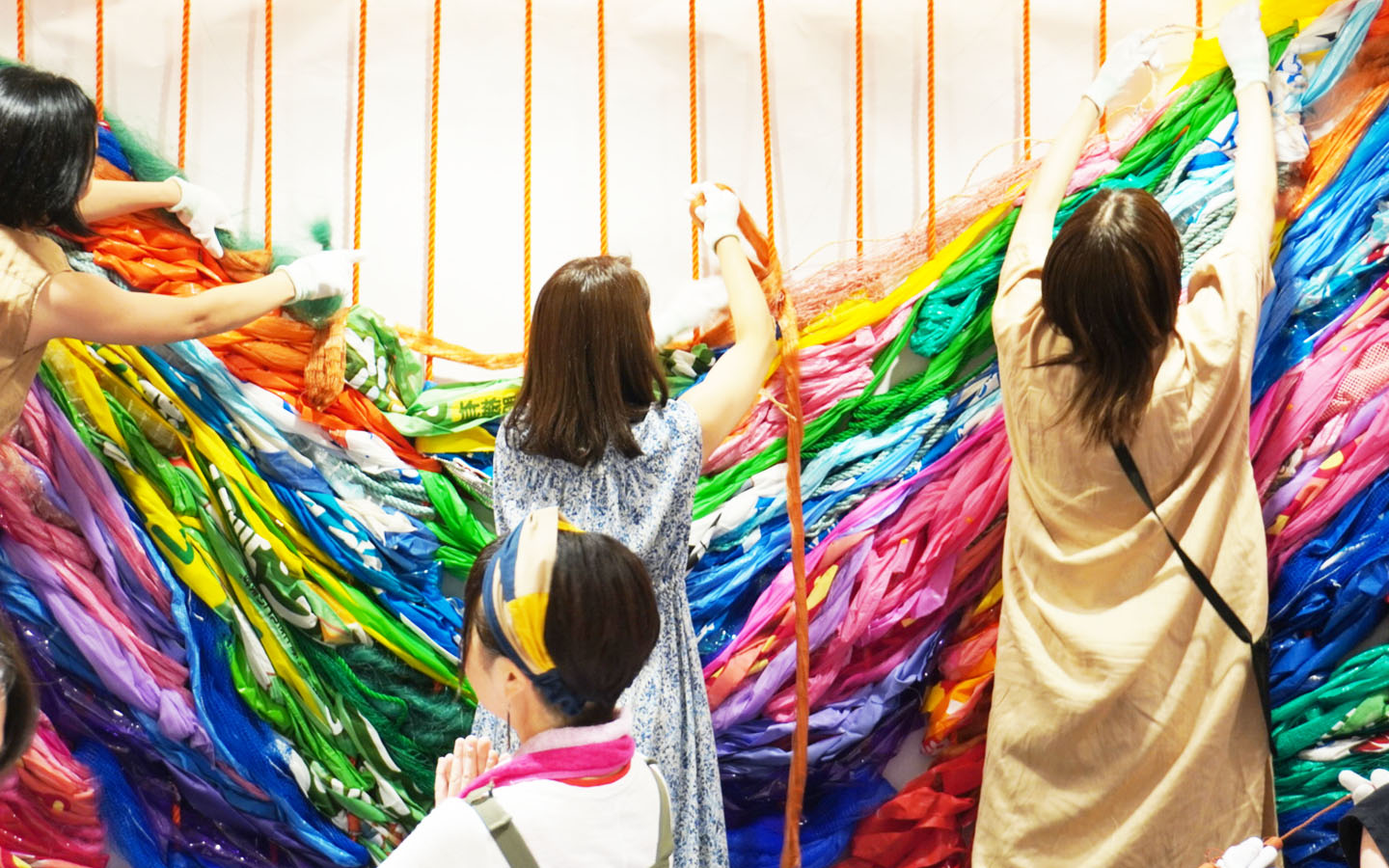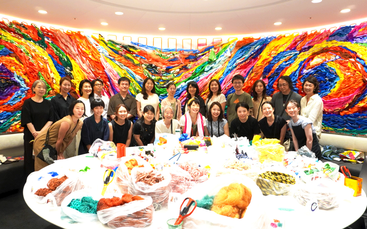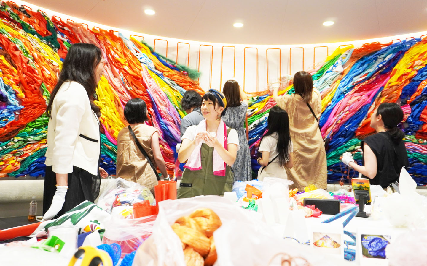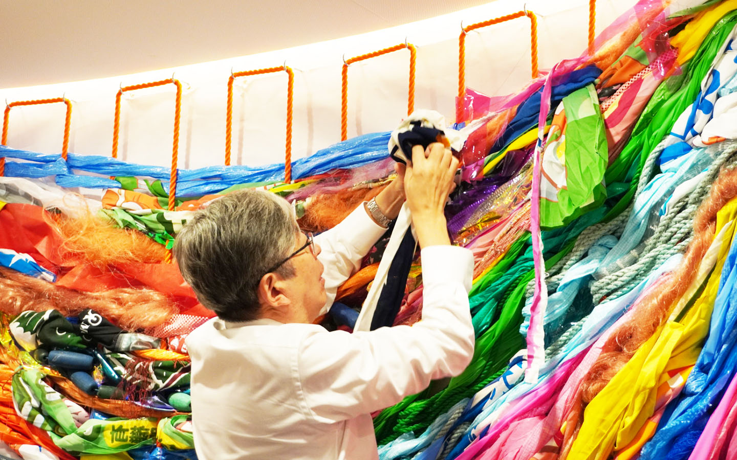 普段は来客との重要な打ち合わせや取材に使われる空間だが、この日は様相が一変。大きな円卓いっぱいに、色とりどりの魚網やロープ、テント地や古布といった廃材が広げられ、湾曲した壁面を色彩豊かで圧倒的な存在感を放つアート作品が覆っていた。