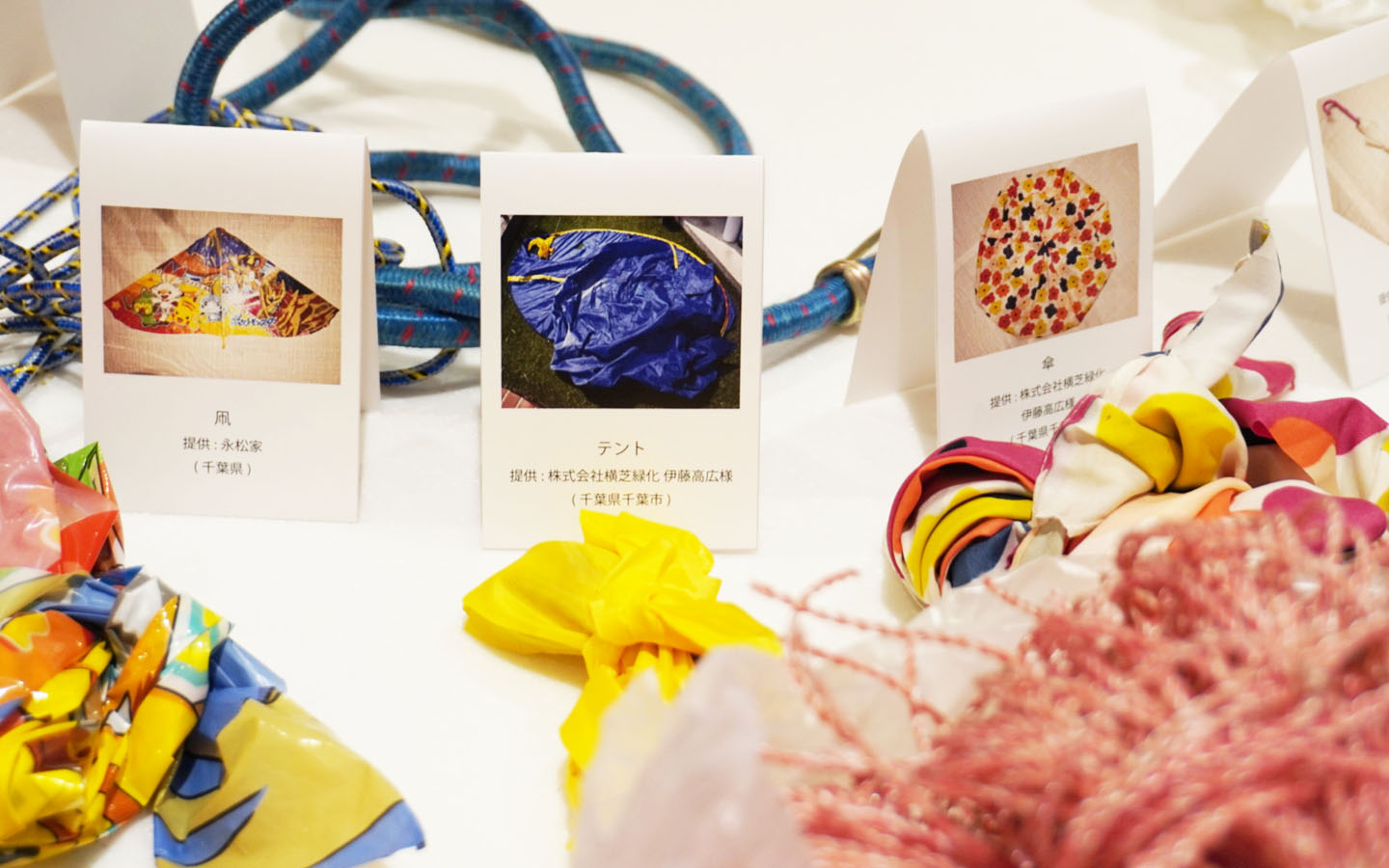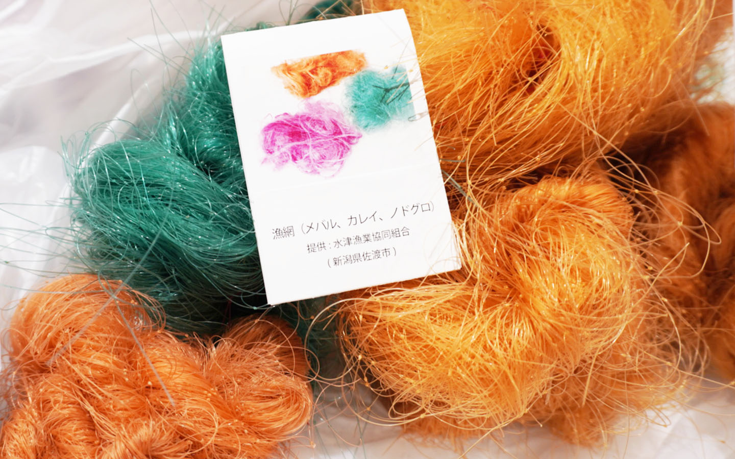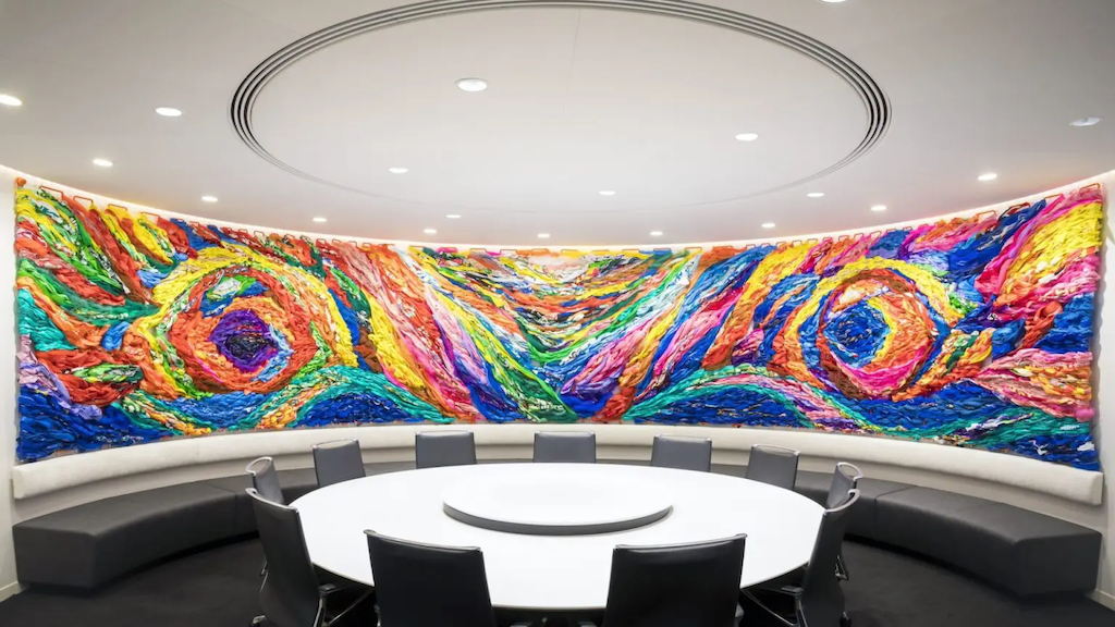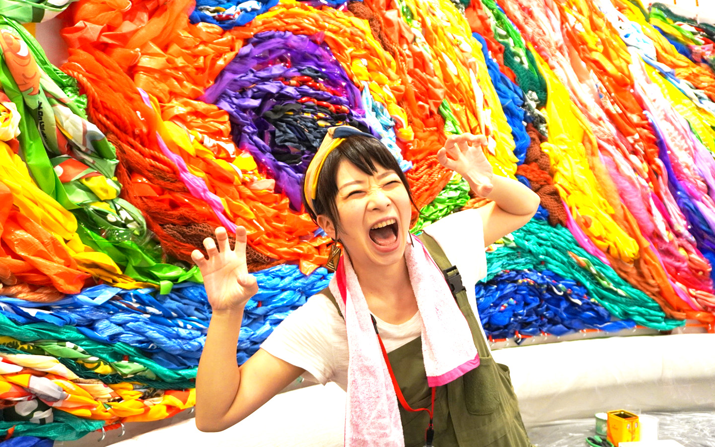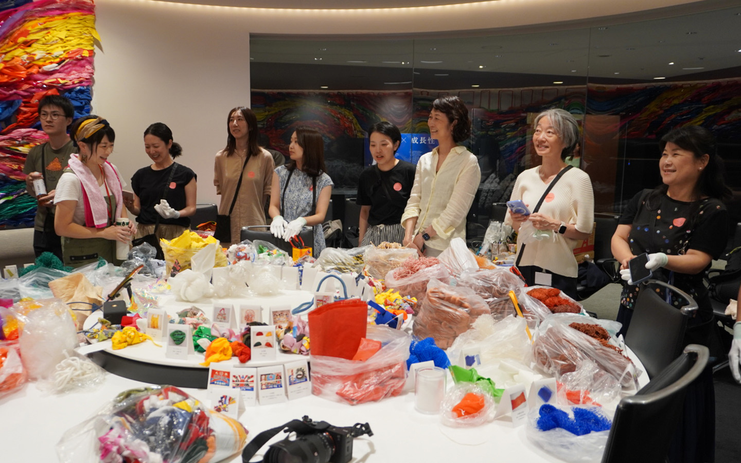 普段は来客との重要な打ち合わせや取材に使われる空間だが、この日は様相が一変。大きな円卓いっぱいに、色とりどりの魚網やロープ、テント地や古布といった廃材が広げられ、湾曲した壁面を色彩豊かで圧倒的な存在感を放つアート作品が覆っていた。