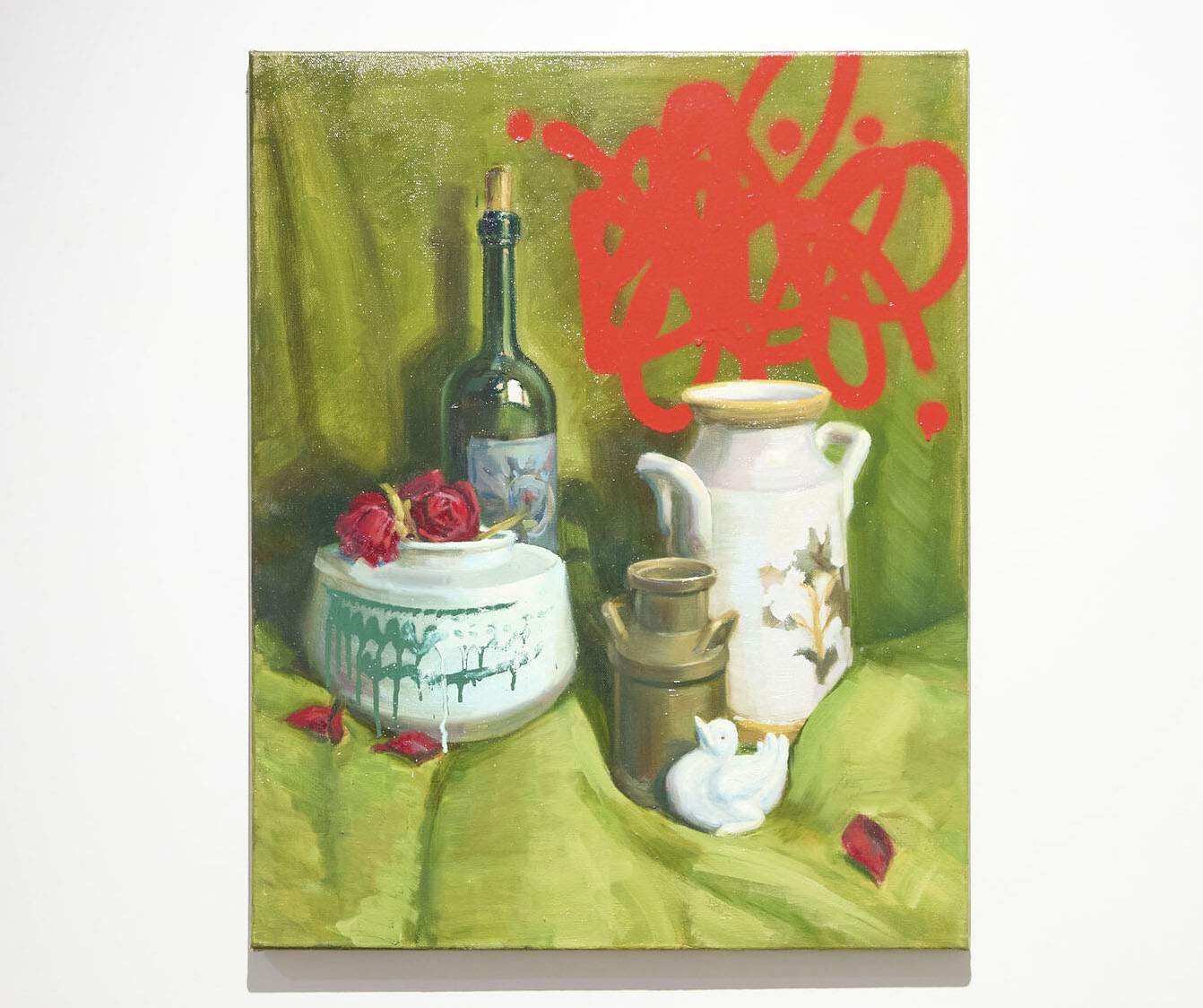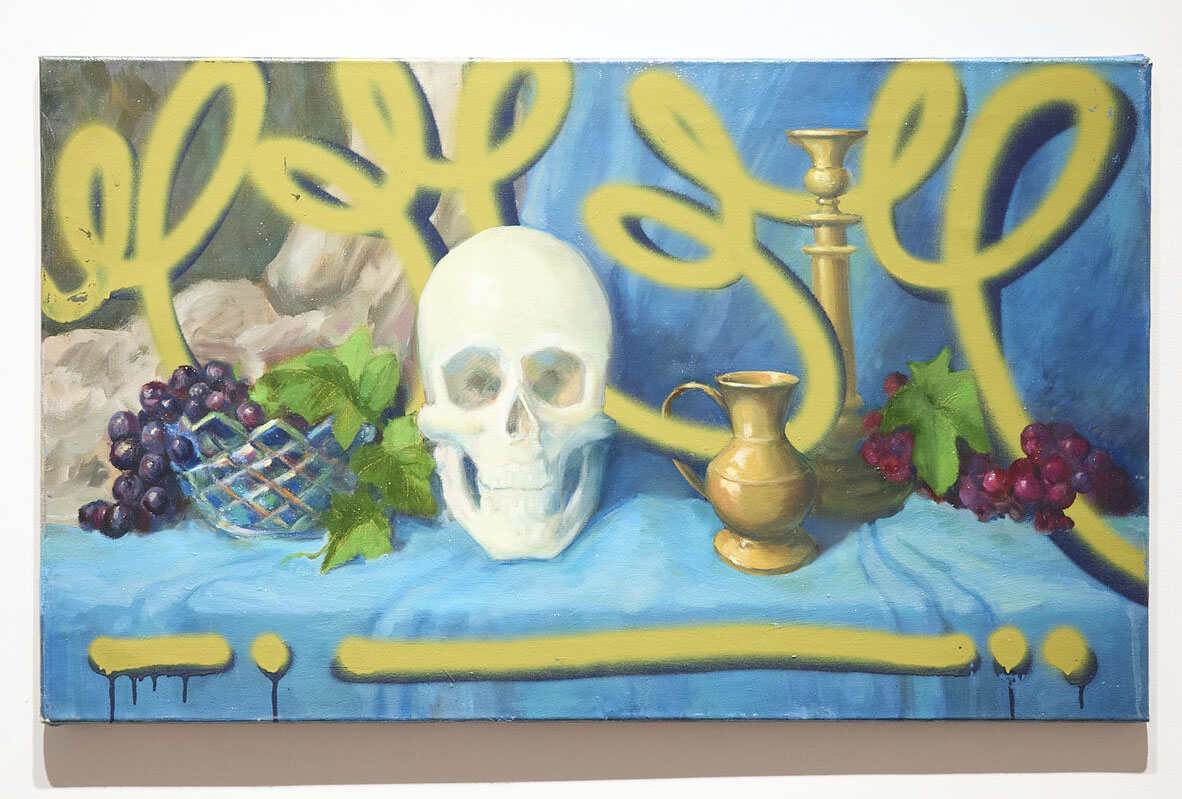 S まず、“アカデミズム”、つまり古典的な静物画を写実的に描いて、その後にグラフィティが加わる、という二つの時間軸が一つになっているんですよね。それで、古典絵画の部分だけ見れば、そういう絵にも見える。そうした二つの層が一枚の絵の中にある。それが面白い。