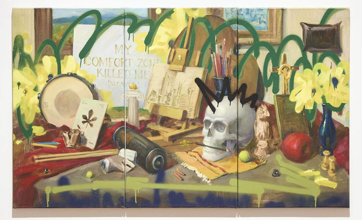 ある日、藤原ヒロシは一人の画家を見つけた。そしてすぐに作品を買い求めた。画家は1992年、ウクライナ・キーウ生まれ。現在はカナダ在住。伝統的画法で静物画や風景画を描き、そこにグラフィティの手法でスプレーペイントを重ねる。二次元(写実)の上に再現された三次元(虚構)を強引に二次元(現実)に引き戻す。あるいは、一つの絵の中に過去(絵具)と現在(スプレー)の2つの時間が流れている。